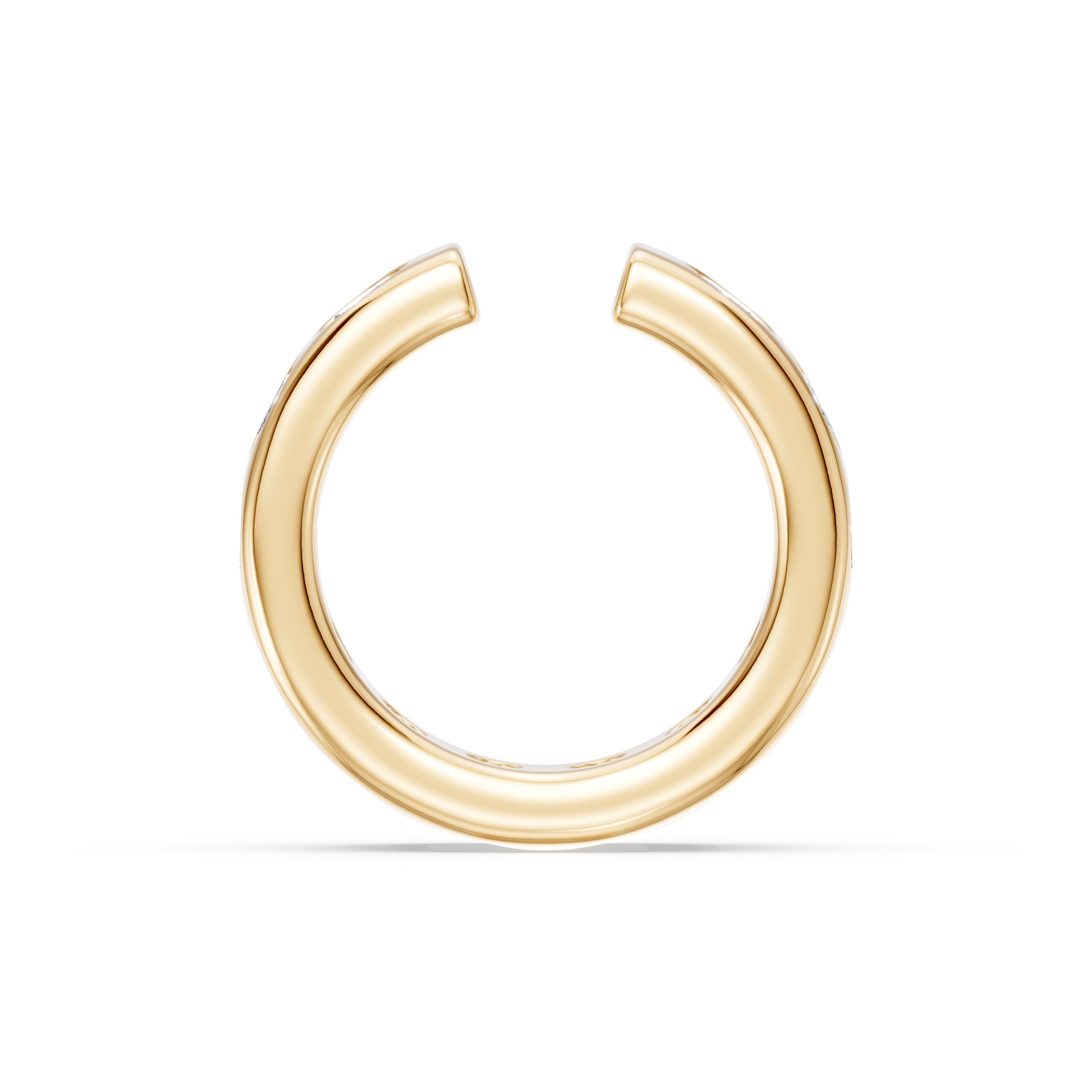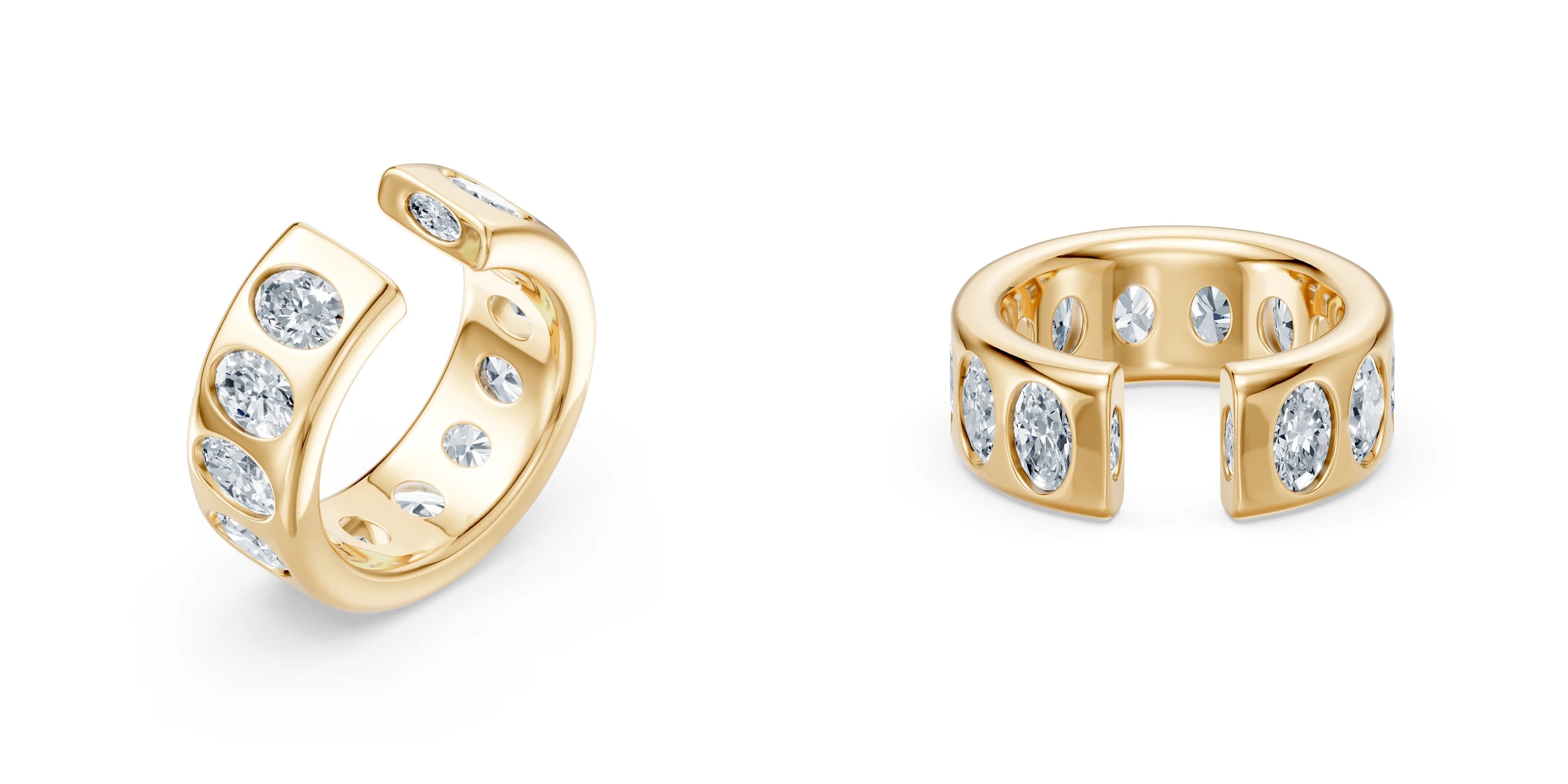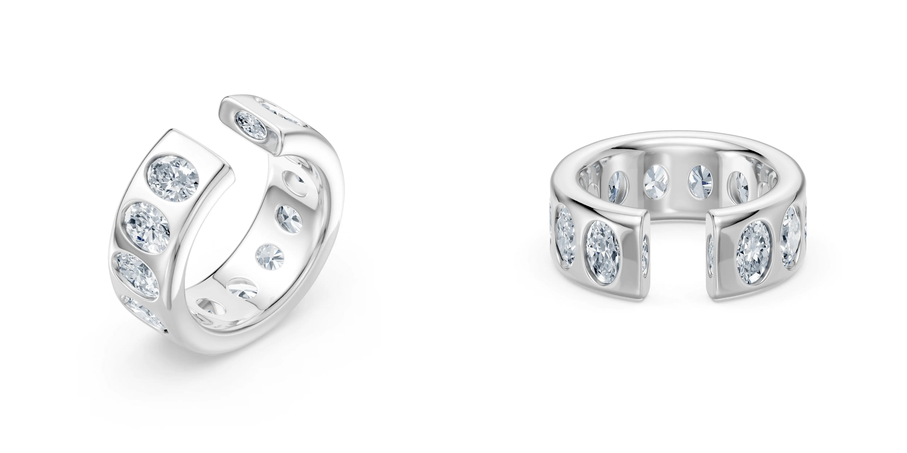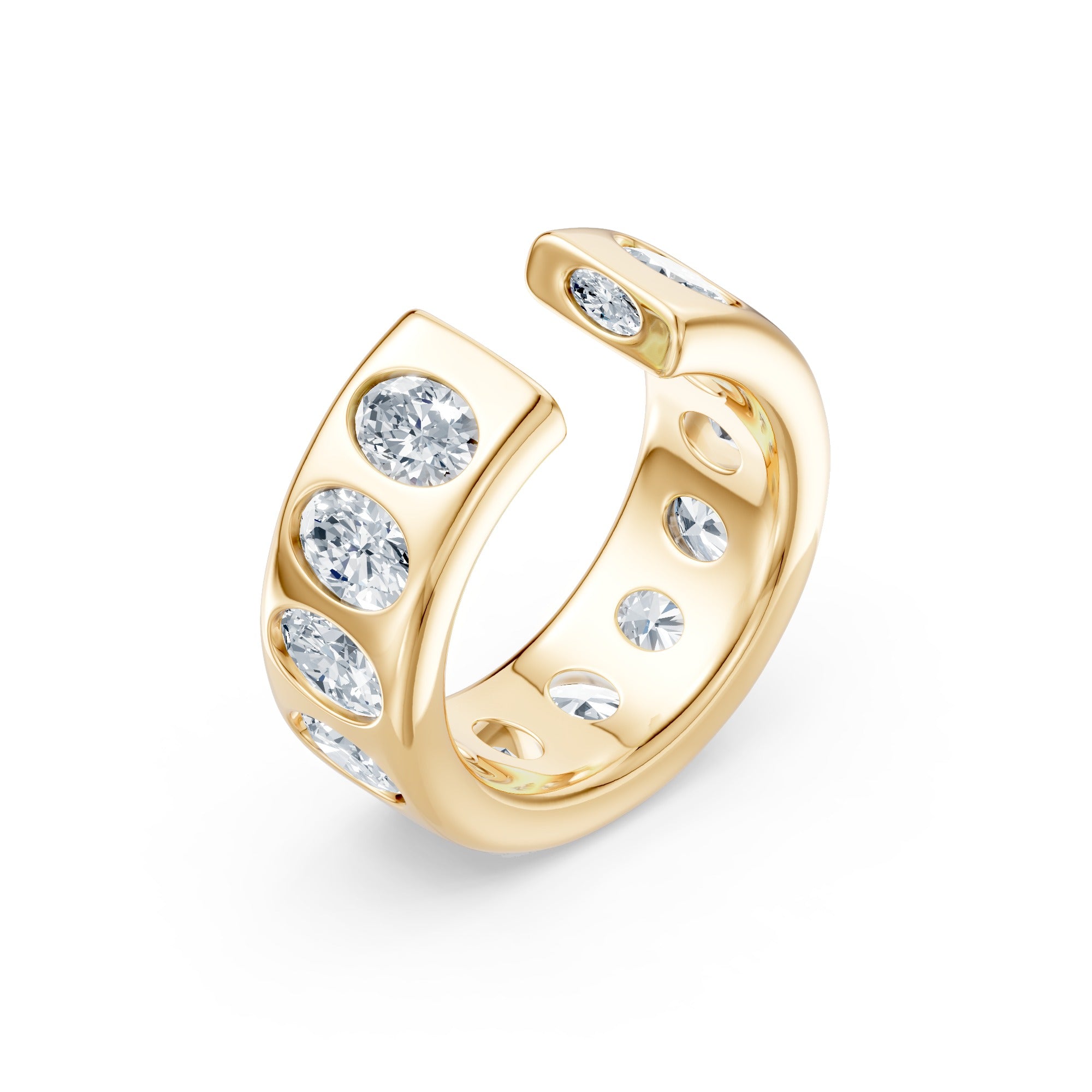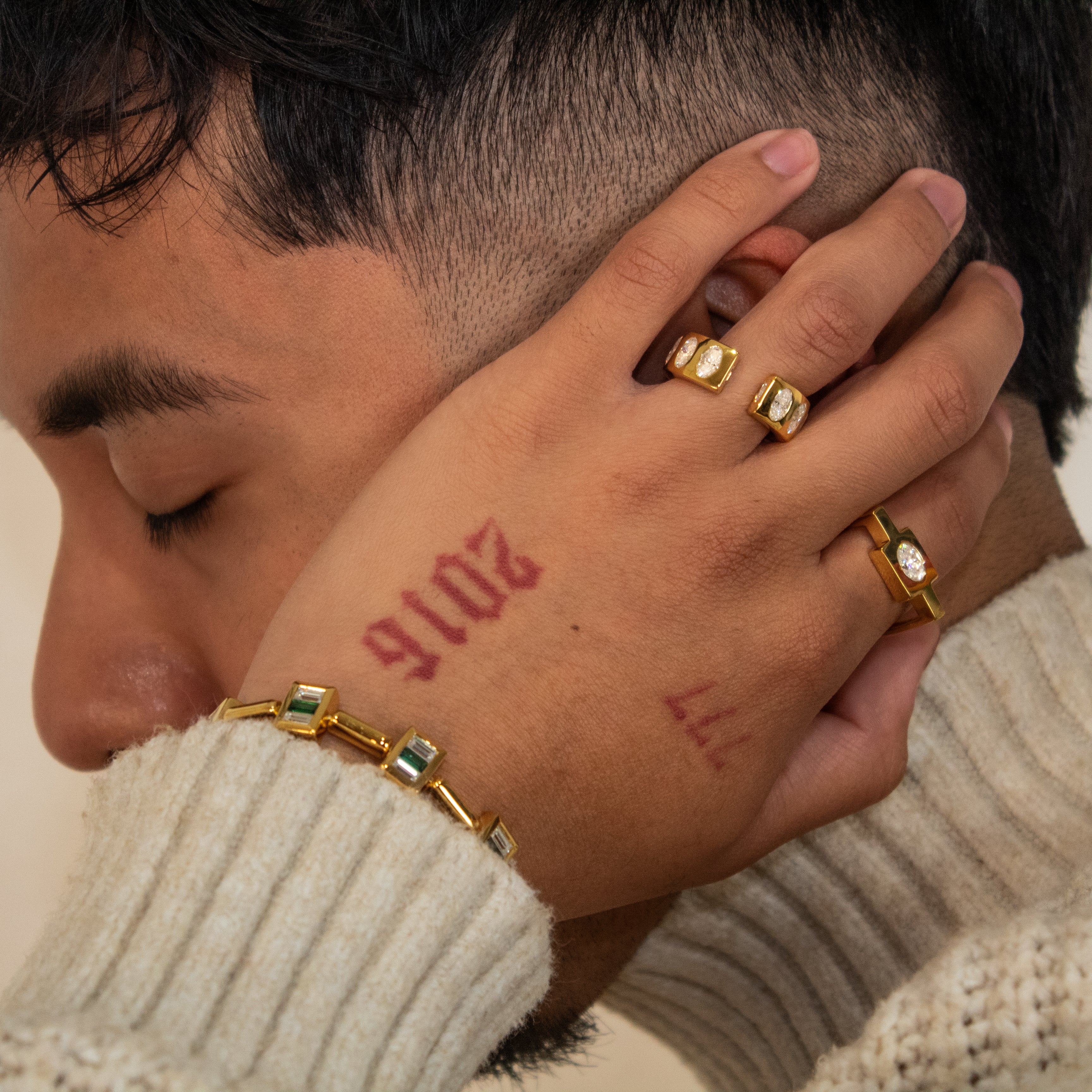 The high-polish metal surface in gold vermeil or sterling silver, amplify the clarity of the stones, creating an interplay of light that’s both modern and understated. Though bold in width, the band maintains Rhizic’s commitment to honest, minimal luxury.