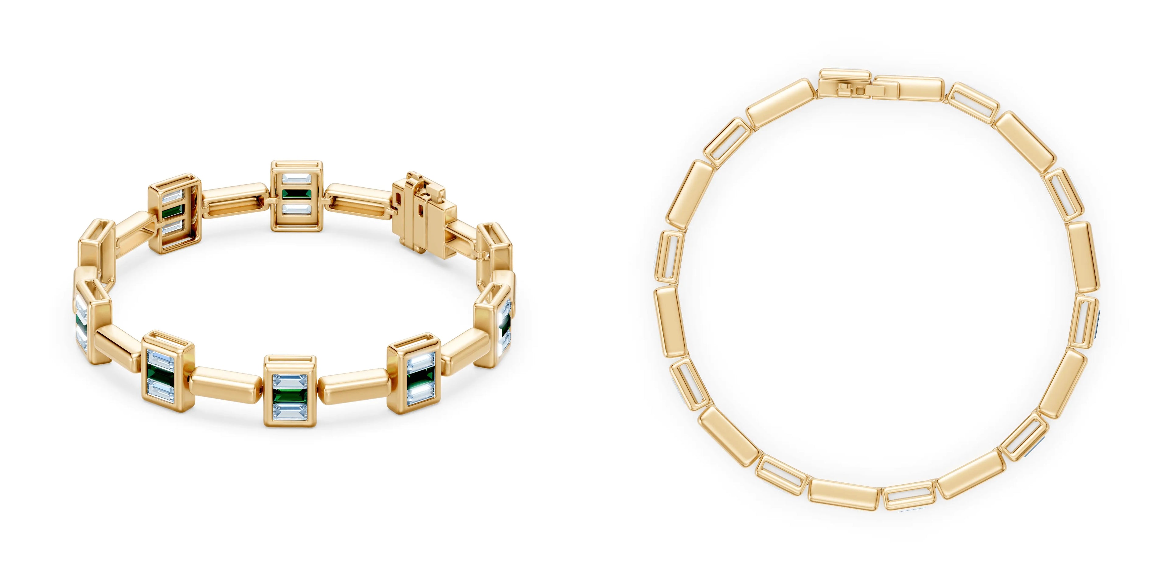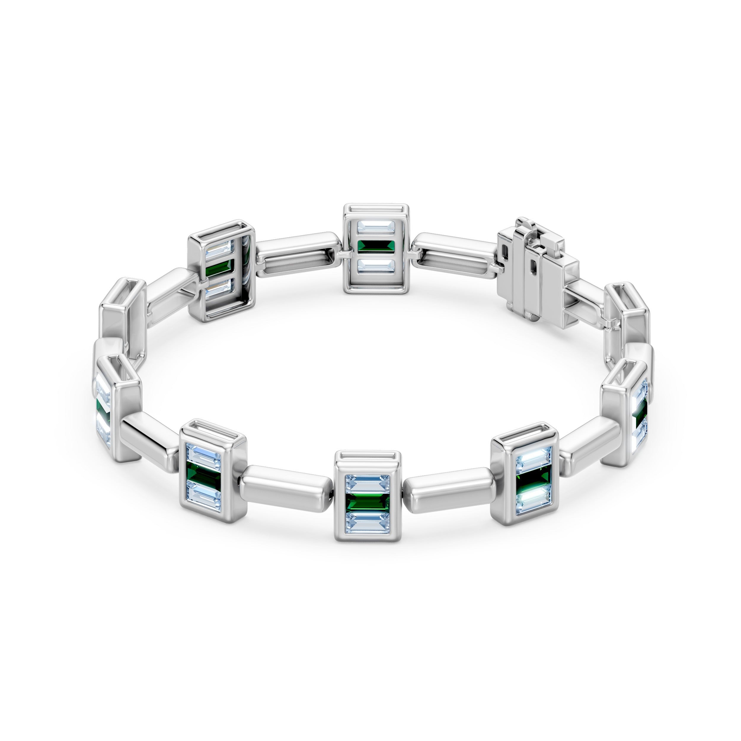 A polished bracelet featuring flush-set baguette-cut emeralds and white moissanite for a clean, modern contrast.