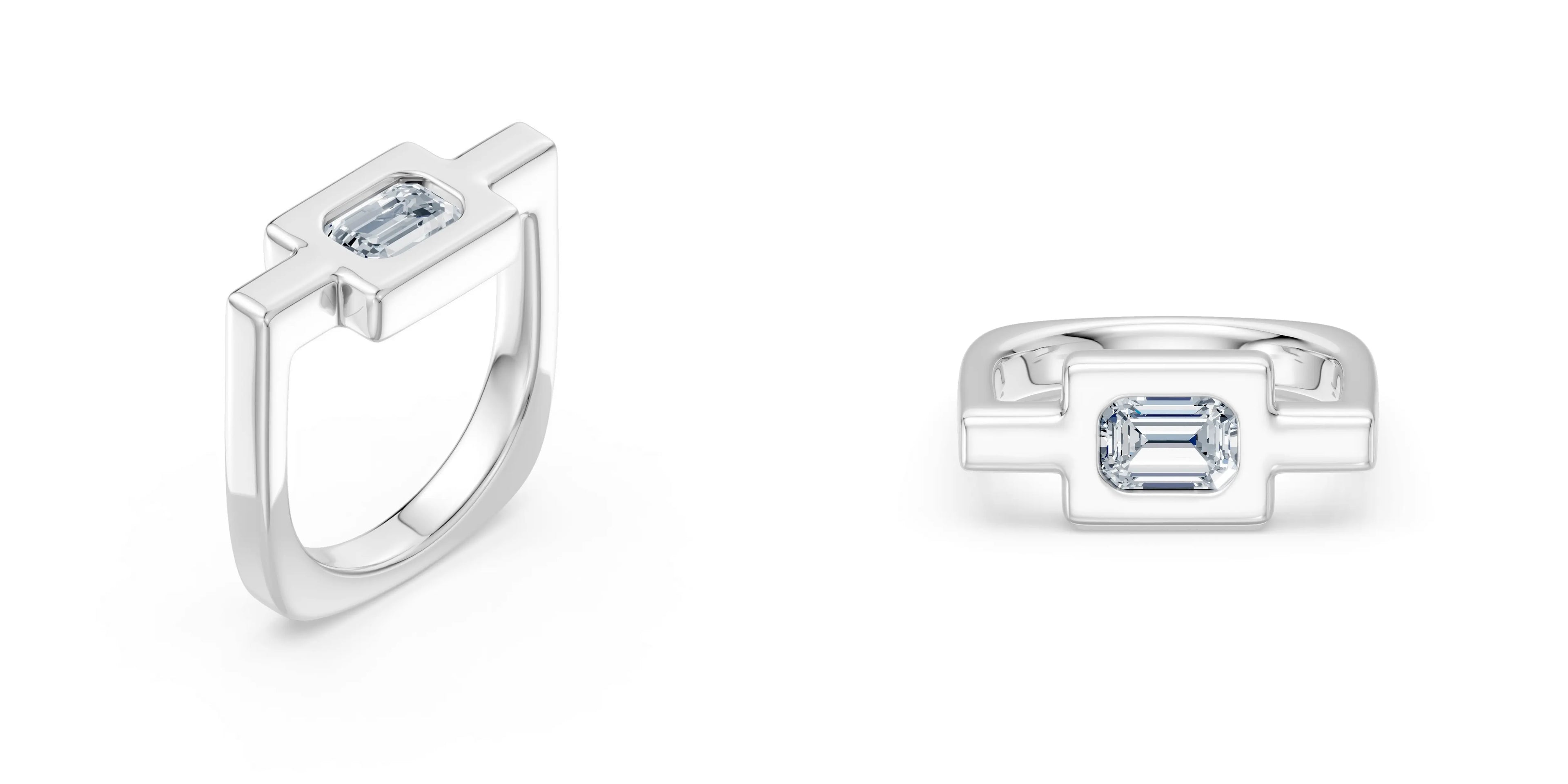 A refined high-polish band set with a flush emerald-cut moissanite for sharp, modern elegance.