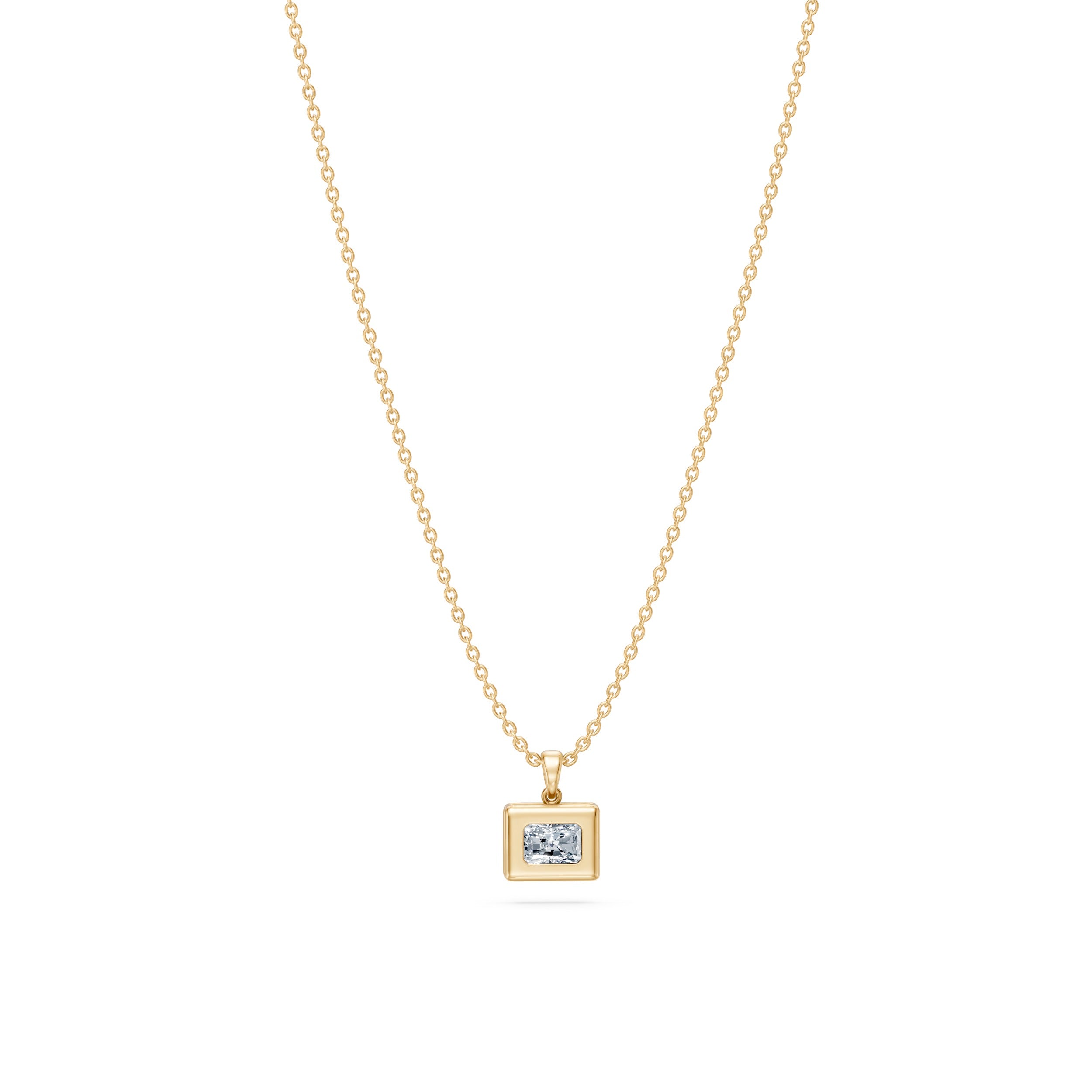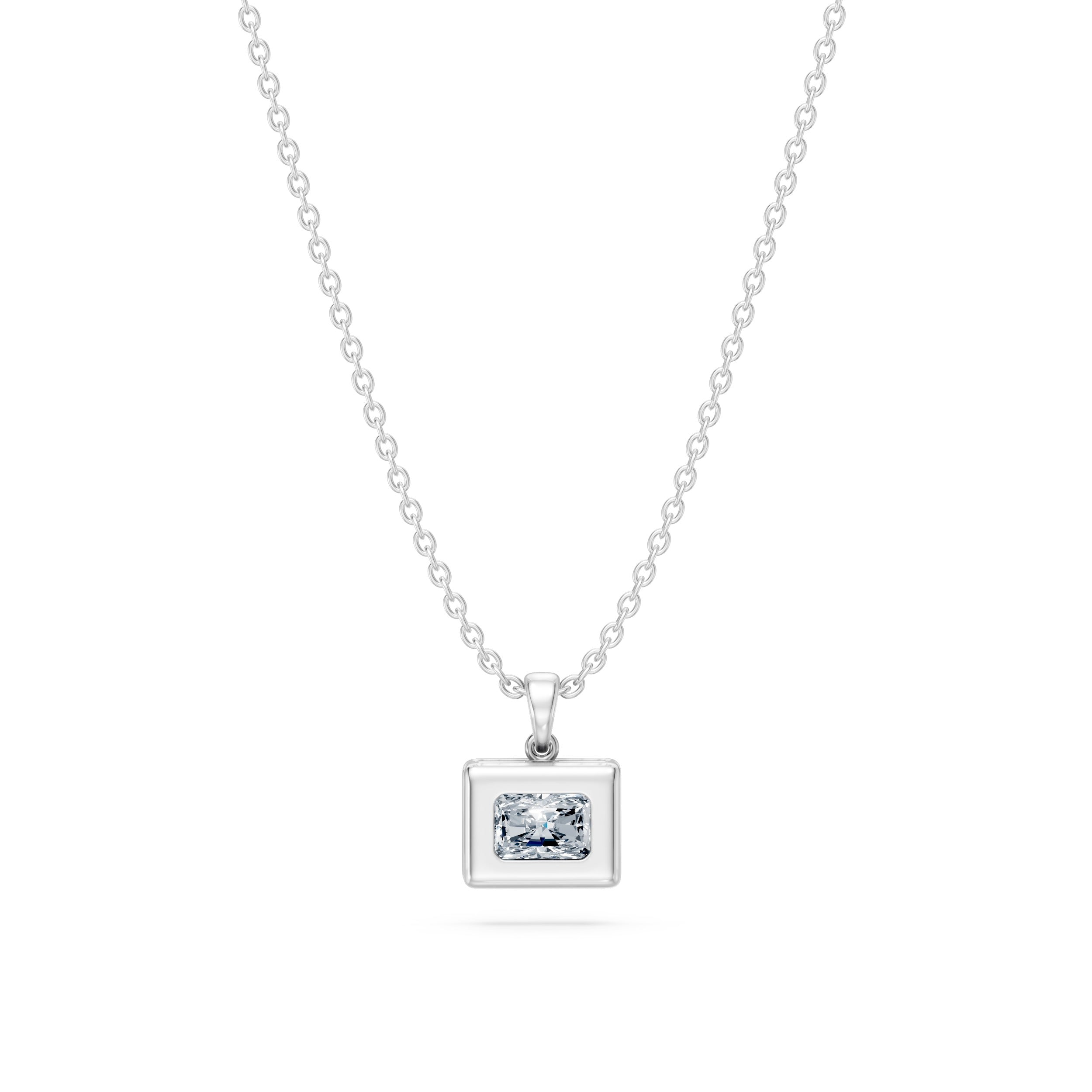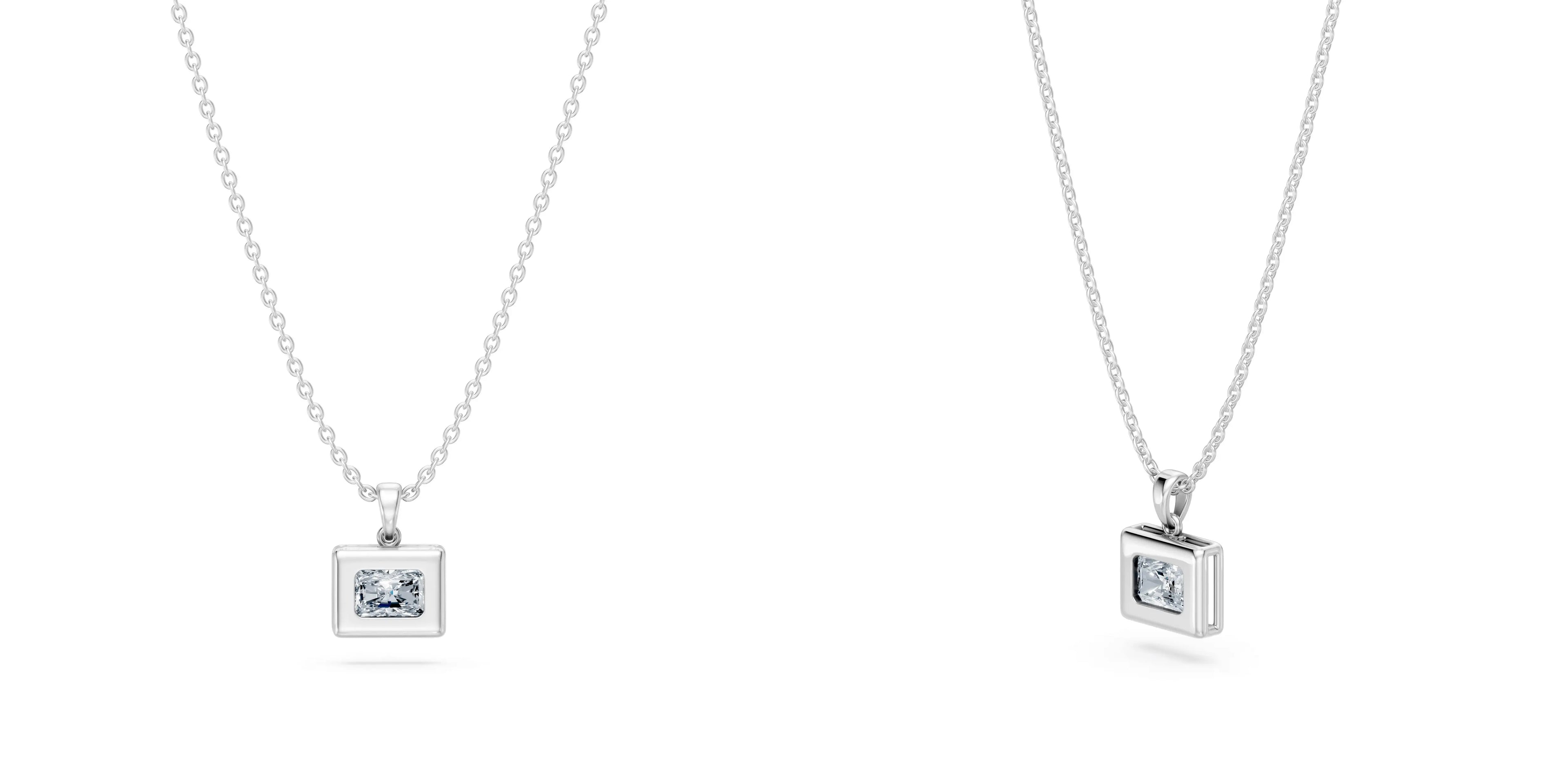 This Radiant-Cut Flush-Set Pendant captures the balance of strength and subtlety that defines our design language. The radiant-cut moissanite — known for its brilliant, structured facets — sits flush within a polished, open-frame setting. The result is a pendant that feels bold yet minimal, with clean edges and natural symmetry.