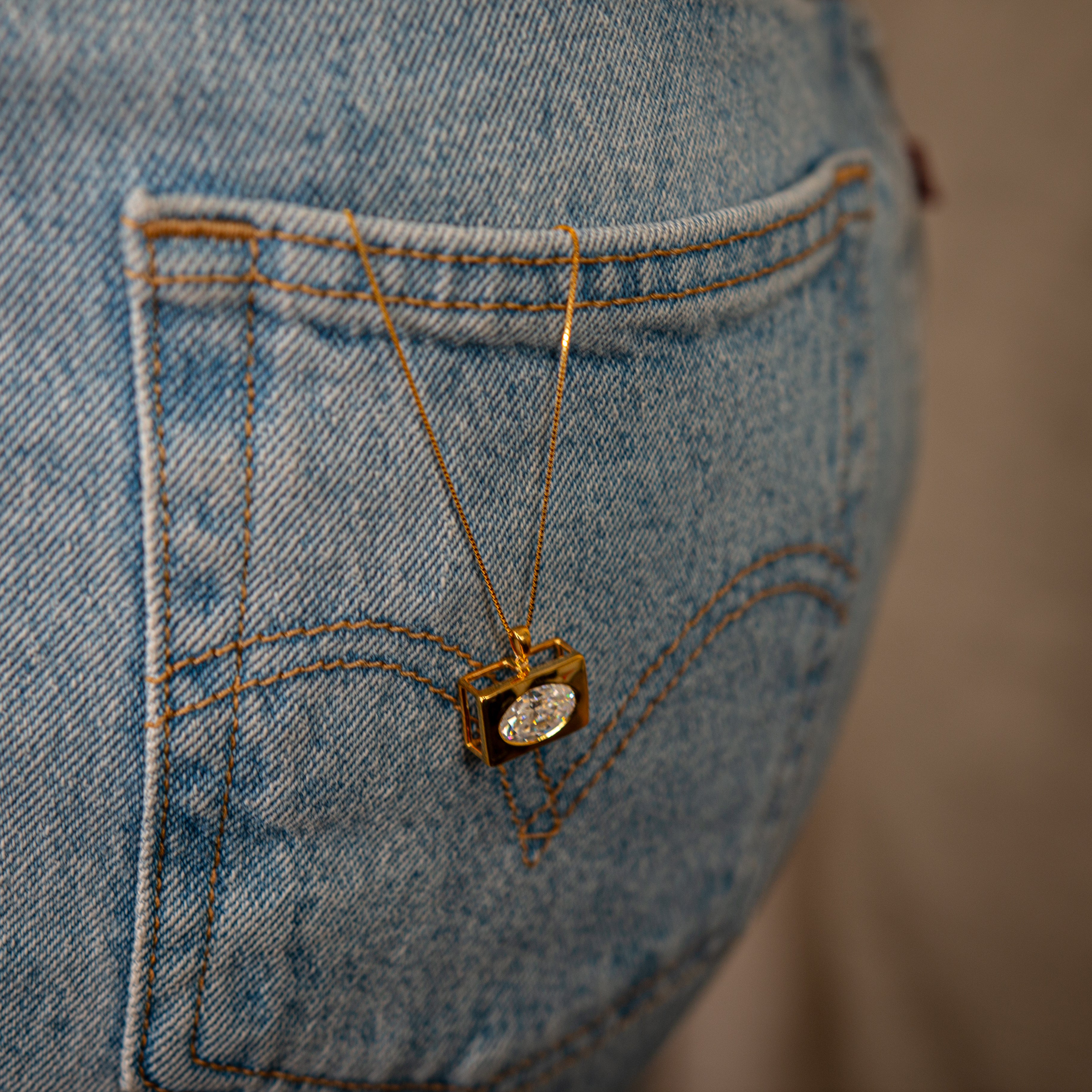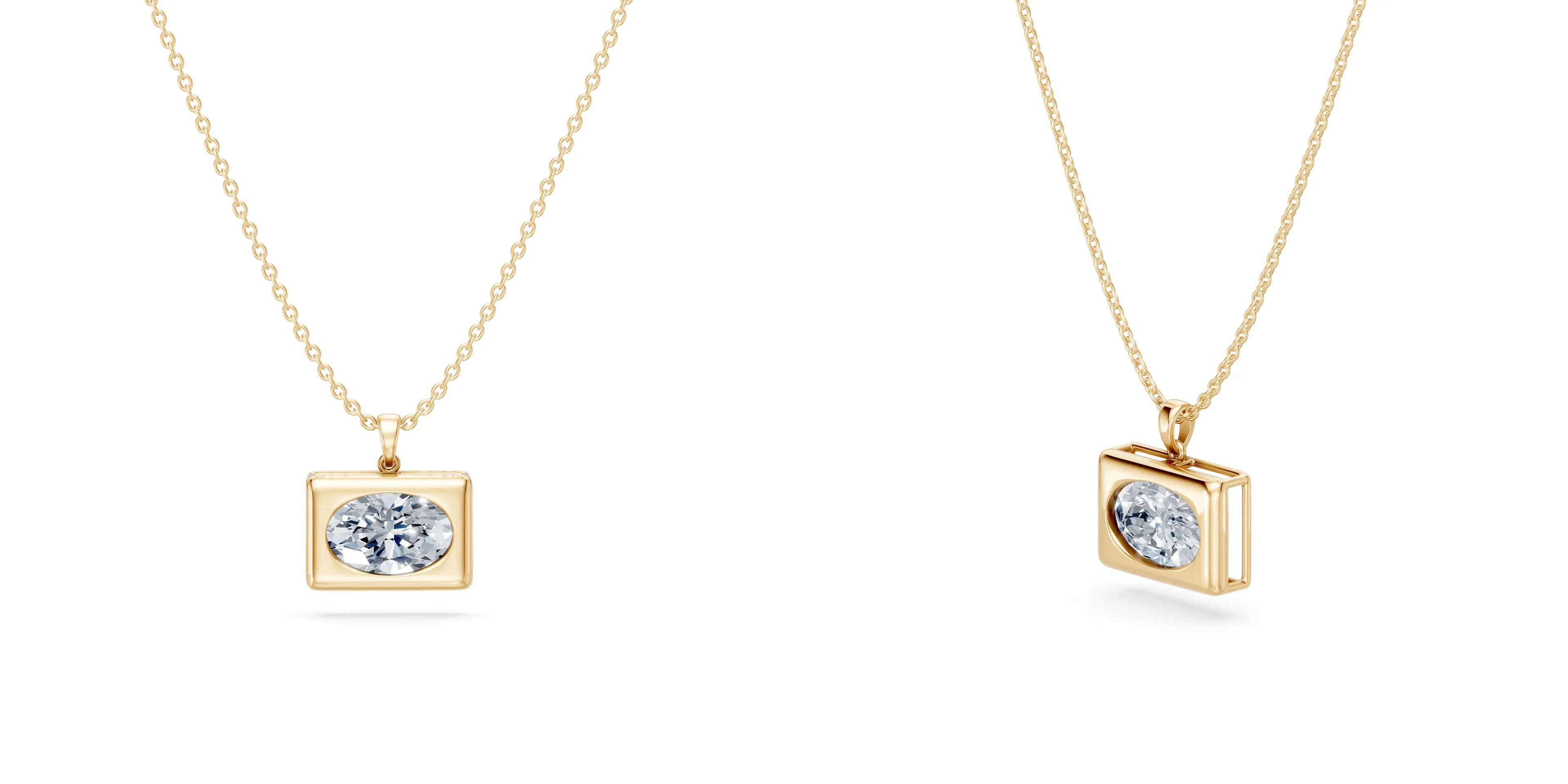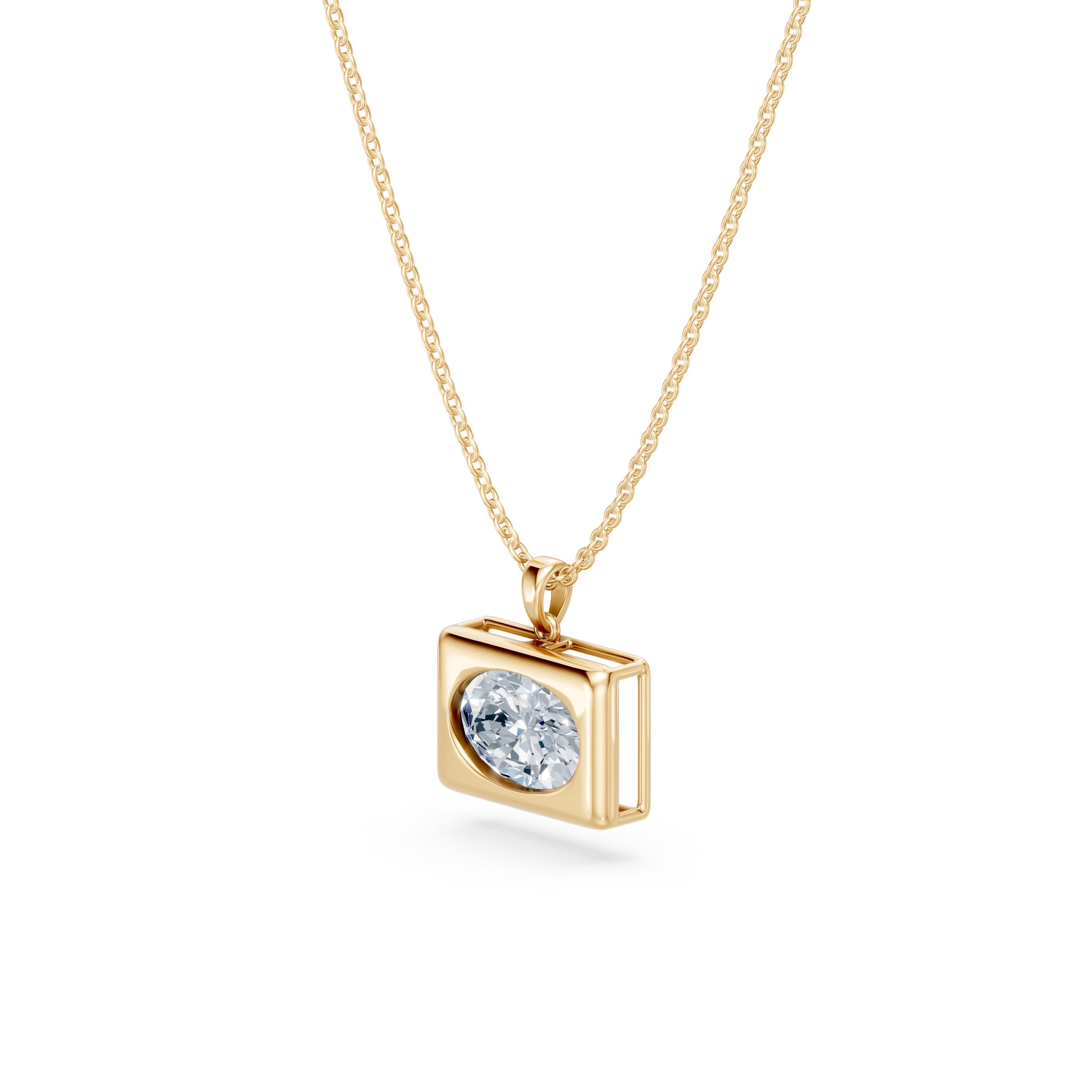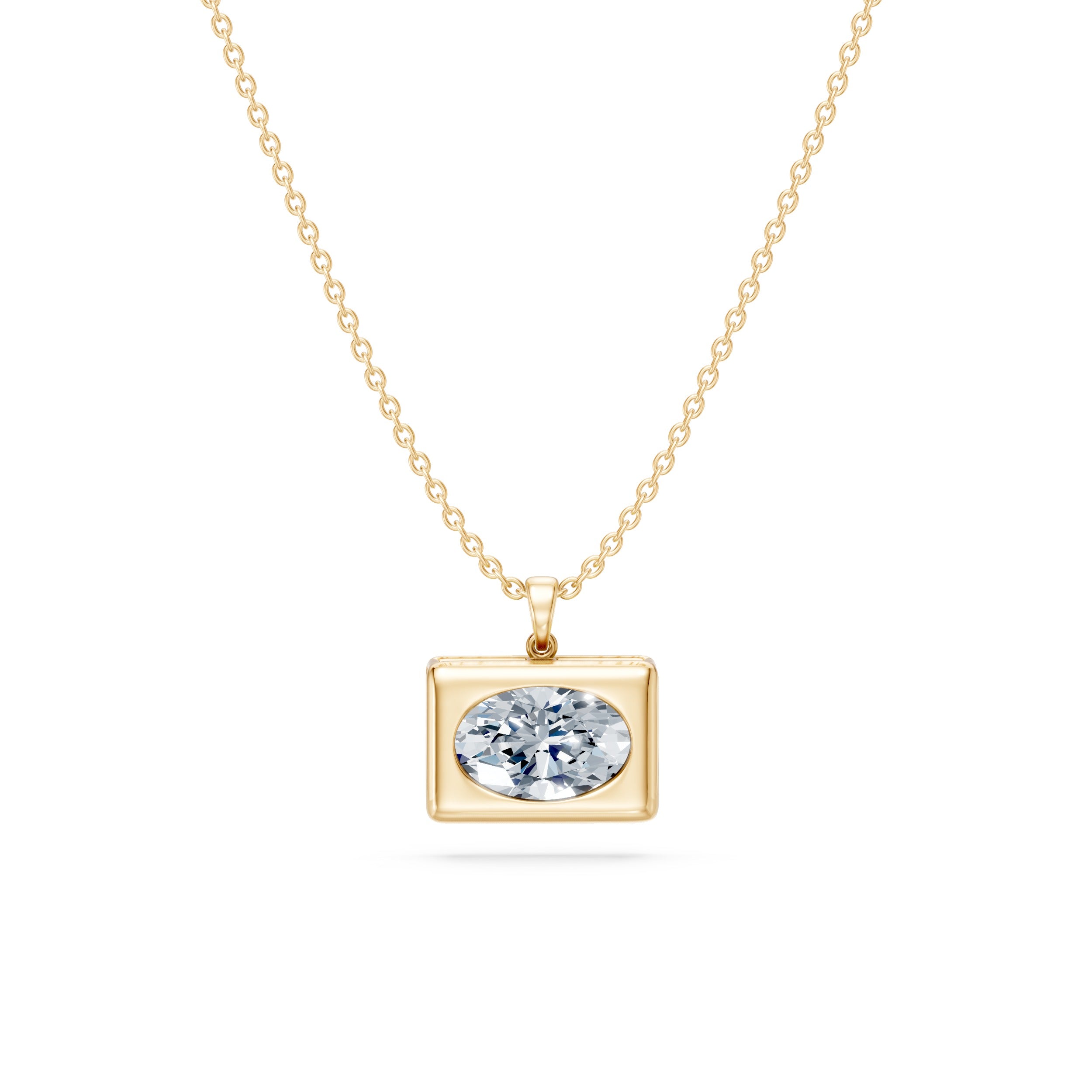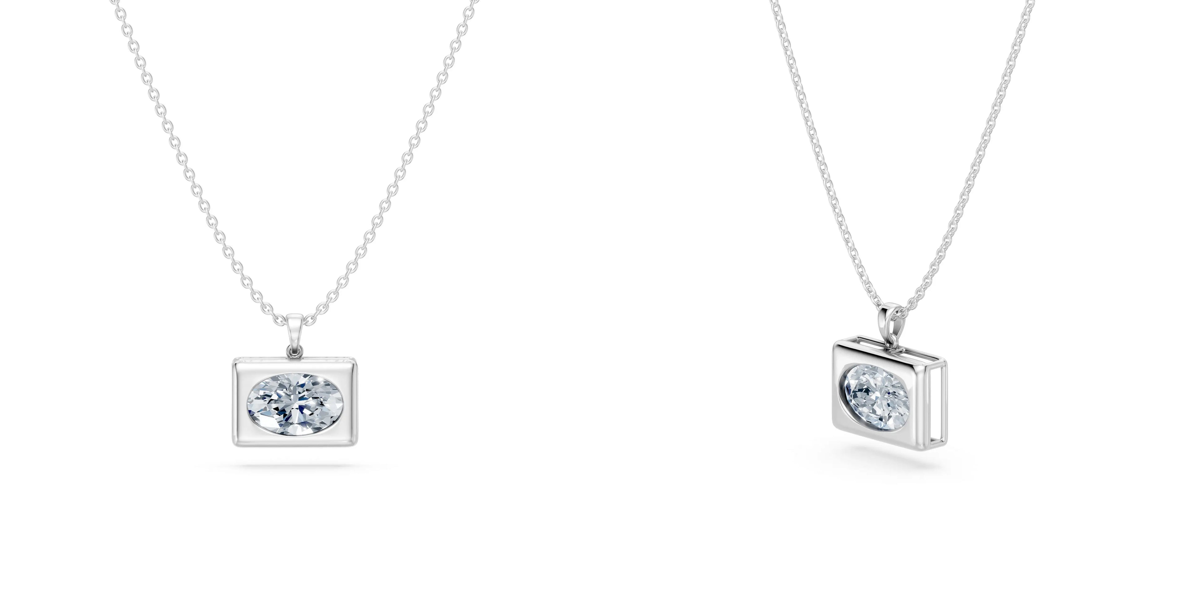 This Oversized Oval Flush-Set Pendant explores the tension between softness and structure. The open polished frame creates a clean, geometric outline, while the oval-cut moissanite introduces a gentle organic curve which develops a contrast that feels intentional and refined.