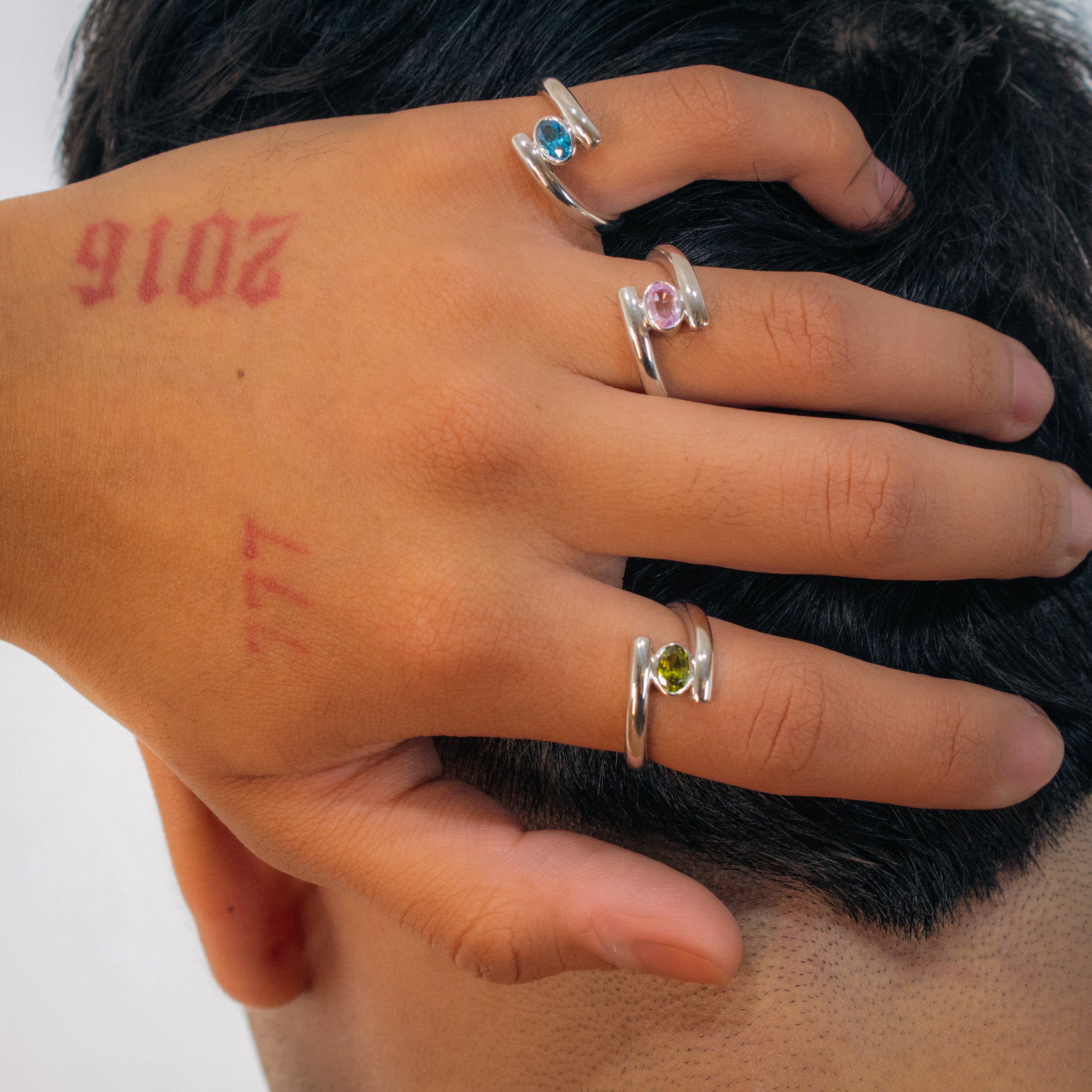 The polished band in gold vermeil or sterling silver provides a clean frame, keeping the overall look modern and minimal. The result is a ring that feels emotional but not sentimental. Its a piece that can represent self- expression, celebration, or simply a connection to color.